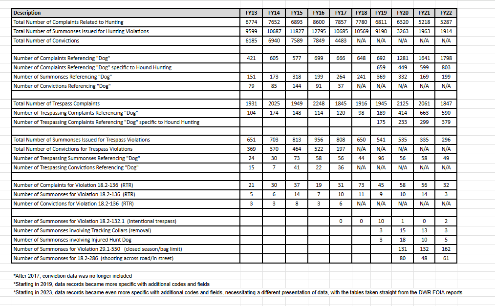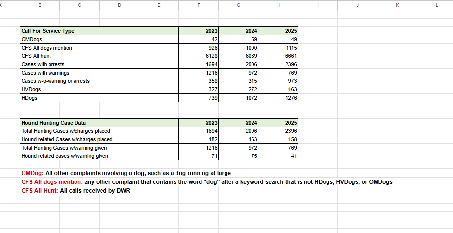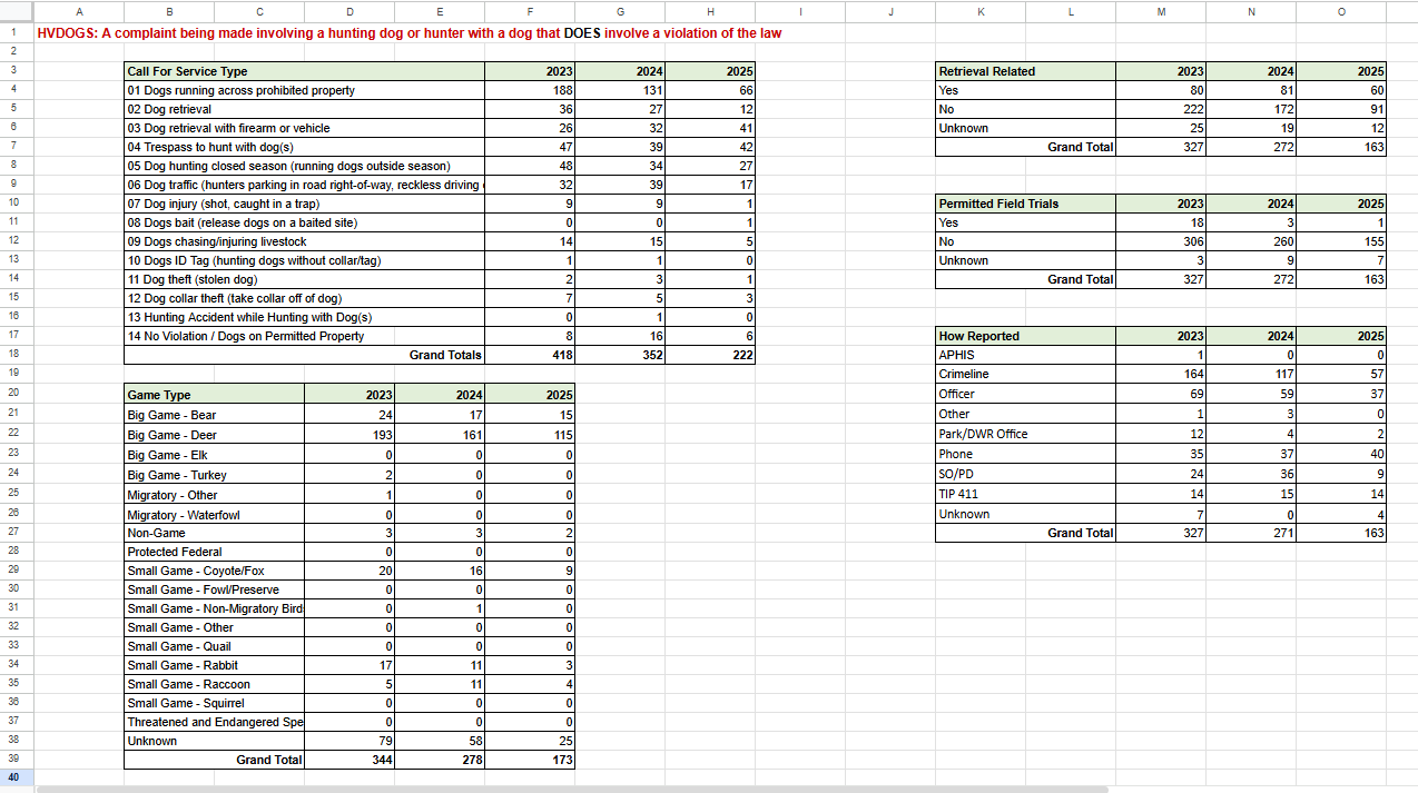 This table is for the code HVDOGS, which is used for a complaint being made involving a hunting dog or hunter with a dog that DOES involve a violation of the law. This is the one that is the most important because these are the actual violations with regard to hound hunting. (This is in contrast to the previous code, which are DWR complaints being made about hound hunting with no violation occurring.)