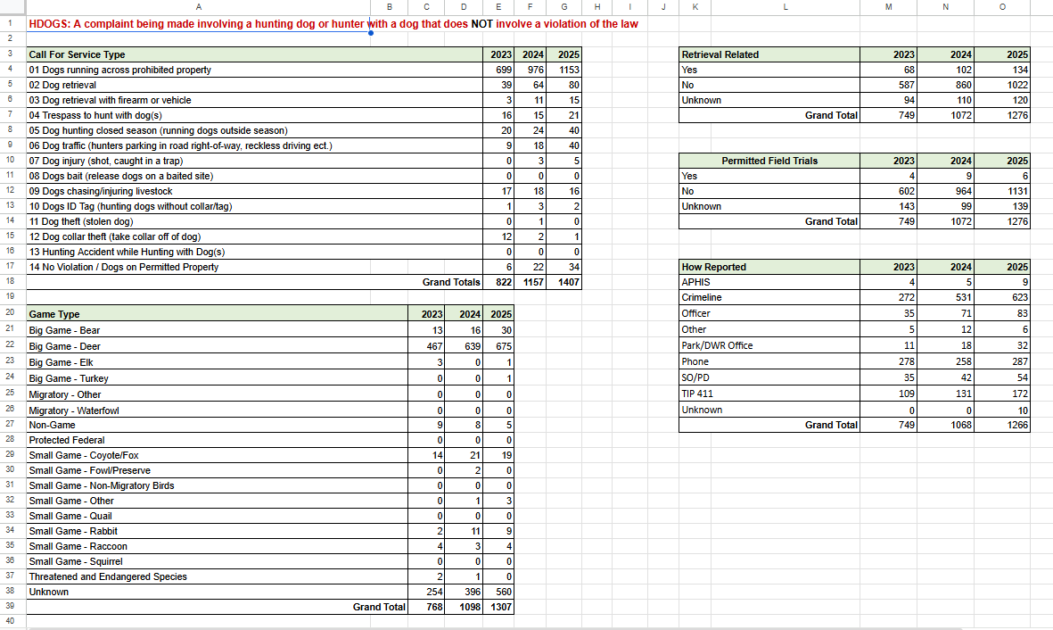 This table is for the code HDOGS, which is used for a complaint being made involving a hunting dog or hunter with a dog that does NOT involve a violation of the law. In other words, these are calls that are made to DWR about hound hunting, but no violation was determined to have taken place.